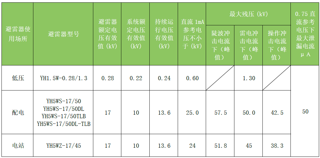 執行標準:GB/T 11032《交流無間隙金屬氧化物避雷器》、GB/T 32520《交流1kV 以上架空輸電和配電線路用帶外串聯間隙金屬氧化物避雷器》